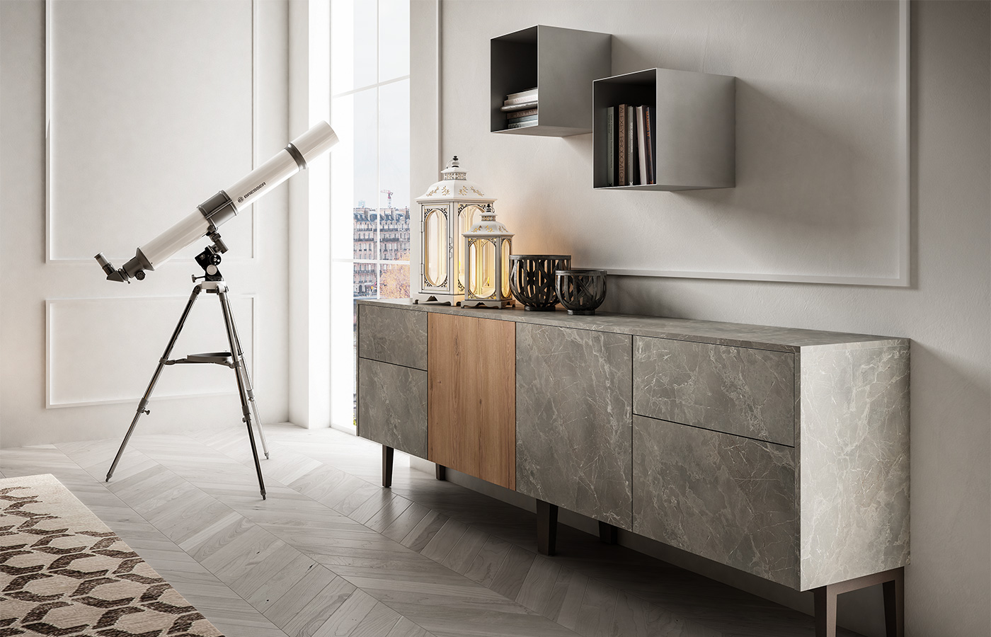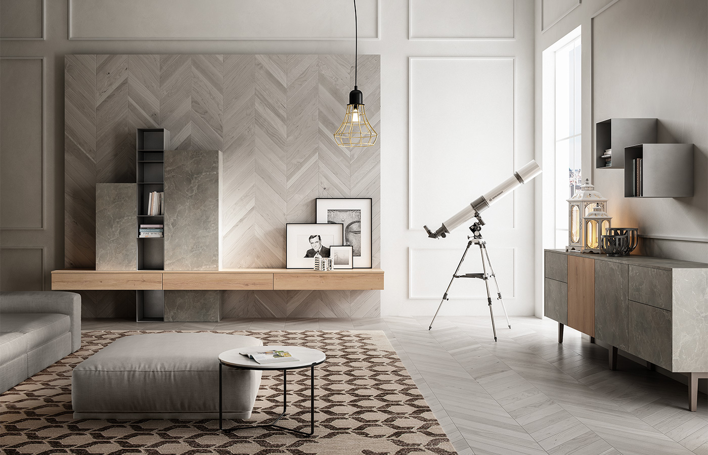 Μια νηφάλια σύνθεση από γκρι πέτρα Kalì, μονάδες βάσης με συρτάρια από δέρμα βελανιδιάς Kalì, συμπληρωμένο με ντουλάπι Aria με βάση στήριξης Υ. 24 cm σε στιλβωμένο μέταλλο. Ανοιχτές μονάδες με μεταλλικό φινίρισμα αέρα εισάγονται σε κάθετες μονάδες τοίχου και τοποθετούνται ελεύθερα στον τοίχο για μια ελαφριά και συντονισμένη αισθητική εμφάνιση.