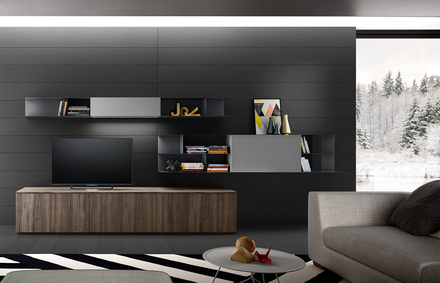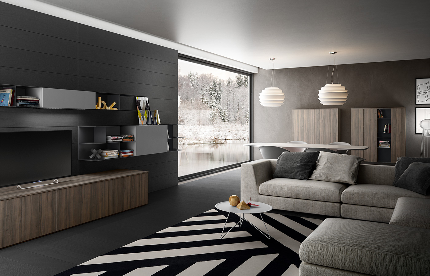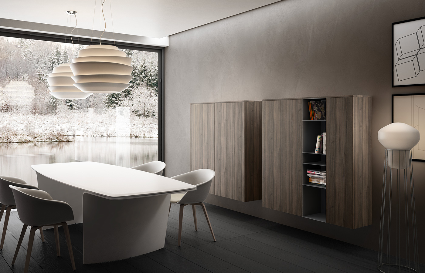 Εκλεπτυσμένοι συνδυασμοί σε ένα πλαίσιο όπου το ξύλο και το μέταλλο είναι τα κυρίαρχα χαρακτηριστικά. Οι γκρι αποχρώσεις των μονάδων τοίχου με λάκα ουδέτερης υπεριώδους ακτινοβολίας, της στρώσης σε όλο το μήκος του τοίχου και των μεταλλικών μονάδων Air αναμειγνύονται με τις μονάδες βάσης και τα ντουλάπια από υλικό Oregon. Οι ζεστές και οι ψυχρές αποχρώσεις μαλακώνουν η μία την άλλη, δημιουργώντας μια λύση εξαιρετικής κομψότητας. Η εκλεπτυσμένη εμφάνιση φαίνεται επίσης στο σχέδιο, για παράδειγμα, στα εκπληκτικά κρεμαστά ντουλάπια.