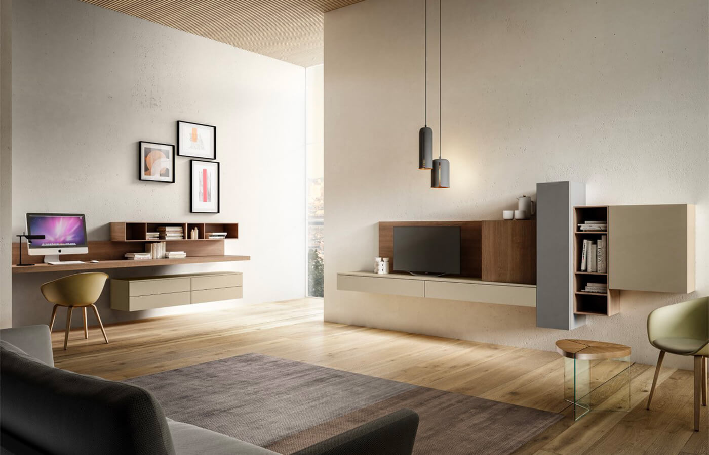 Νέο και δυναμικό μοντέλο, σχεδιασμένο για να εκτιμηθούν όλες οι ιδιότητές του. Ένα ράφι από ιταλική καρυδιά Kalì δημιουργεί έναν σταθμό εργασίας με μικρά ανοιχτά διαμερίσματα. Η σύνθεση επεκτείνεται με επιτοίχιες μονάδες βάσης στο Kalì Ottawa Beaver Fenix και μια μονάδα κάθετου τοίχου σε Kalì maximatt Pet. Ένα ενιαίο αλλά πολύ ευέλικτο δωμάτιο.