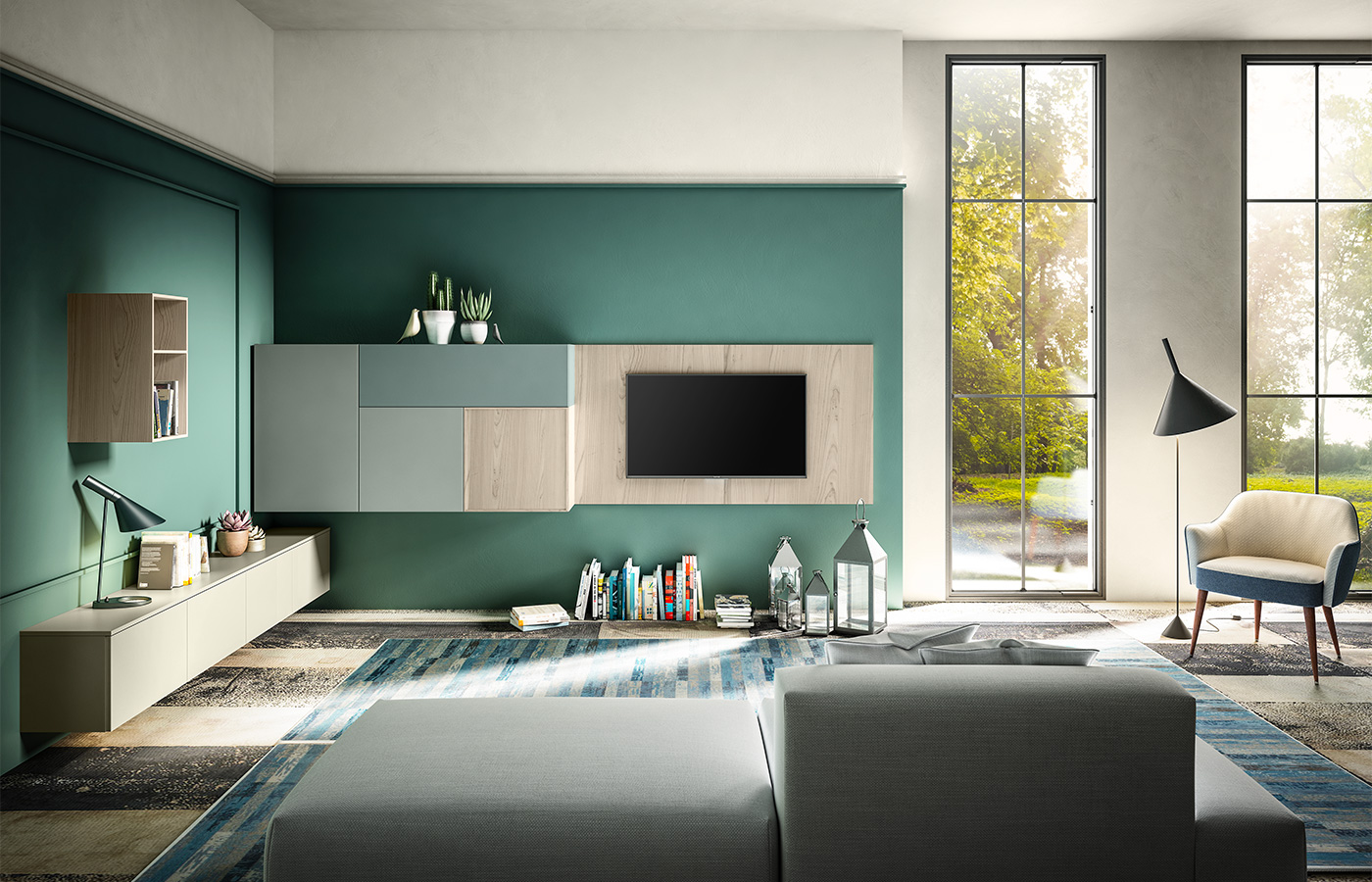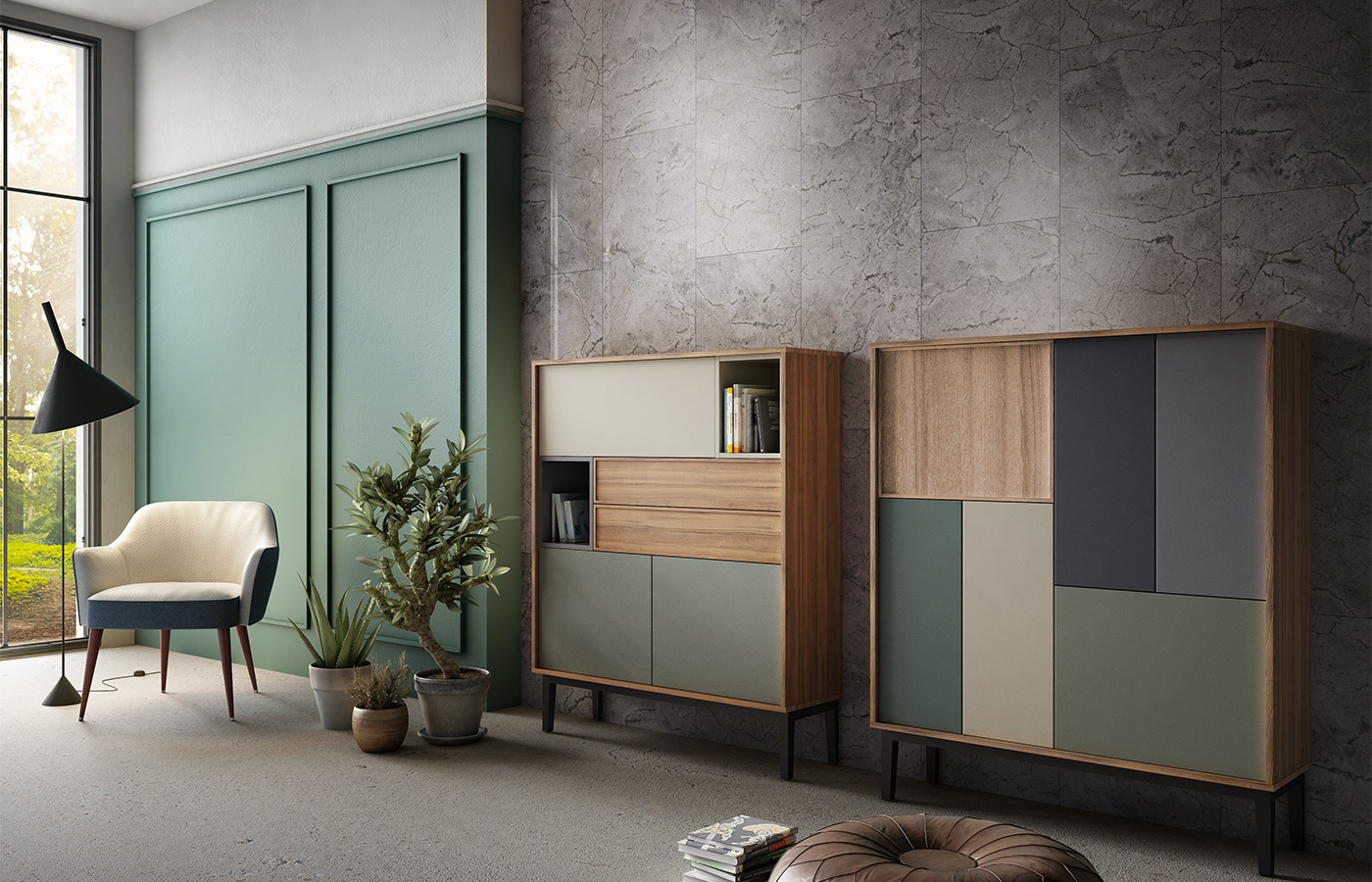 Ένα ελκυστικό ντουλάπι με πόρτες σε διαφορετικά χρώματα, συμπεριλαμβανομένης της Time matt wood green and moss green λάκας και Aria Cortina Larch, που συνεχίζει με ροδέλες και ανοιχτές μονάδες. Η χρωματική παλέτα είναι επίσης ένα εντυπωσιακό χαρακτηριστικό δύο επιτοίχιων ντουλαπιών πάνω από μια μονάδα βάσης Υ. 24 cm με στιλπνό φινίρισμα. Επιτοίχιες μονάδες βάσης σε λάκα Time matt πράσινη ελιά.